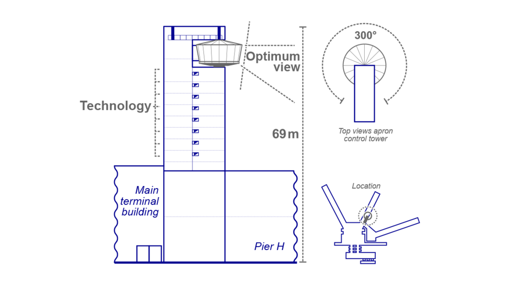Apron controllers observe everything that moves on an airport’s apron, taxiways, and runways. They keep a vigilant eye on the complex traffic situation and give the pilots instructions. Especially at Germany’s largest airport, this calls for a good view – after all, in 2019 an average of 1,400 aircraft took off and landed here every day. Since the new Terminal 3 will also generate more ground traffic in the south of the airport, a new apron control tower is being built here.