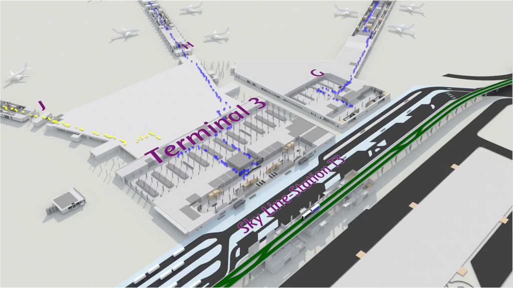 Auf jeden Fall! Die bestehende Sky Line bildet das Rückgrat der Verbindung zwischen Terminal 1 und Terminal 2 und ist damit gerade für alle Transitreisenden von oder zu Terminal 1 wichtig. Lassen Sie uns zur Verdeutlichung folgendes annehmen: Sie landen als Fluggast in Terminal 1 und haben einen Anschlussflug mit einer anderen Airline geplant. Egal ob der Anschlussflug in Terminal 2 oder in Terminal 3 stattfindet, ist zunächst die bestehende Sky Line Ihr Verkehrsmittel der Wahl, das Sie komfortabel und schnell zu Terminal 2 bringt. Dazu können Sie eine der drei Stationen im Bereich A, B oder C nutzen. In Terminal 2 angekommen, steigen Sie aus und gehen zu Ihrem Flieger oder Sie steigen in die neue Sky Line für eine Weiterfahrt zu Terminal 3 um. Von Terminal 2 bzw. Terminal 3 aus funktioniert dies natürlich auch ganz einfach umgekehrt.