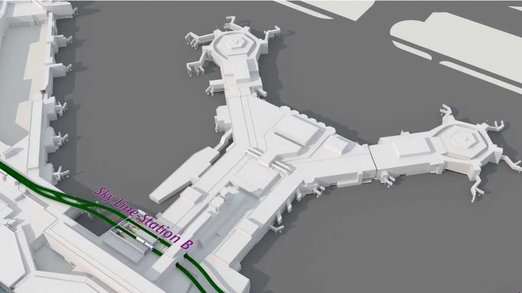 Eine naheliegende Option für die Anbindung von Terminal 3 war es, die bestehende Sky Line-Bahn einfach zu verlängern und bis in den Süden des Flughafens Frankfurt zu Terminal 3 auszubauen. Diese Variante klingt zwar sehr logisch, hat aber gewichtige Nachteile. Vor allem hätten Reisende vom Regional- und Fernbahnhof einen wesentlich längeren Weg zu Station B, die mitten im Terminal 1 liegt. Die Wege dorthin und die Station B selbst sind nicht auf die Menschenmengen, zumal mit Reisegepäck, ausgelegt. Umfassende Umbauten wären erforderlich gewesen.