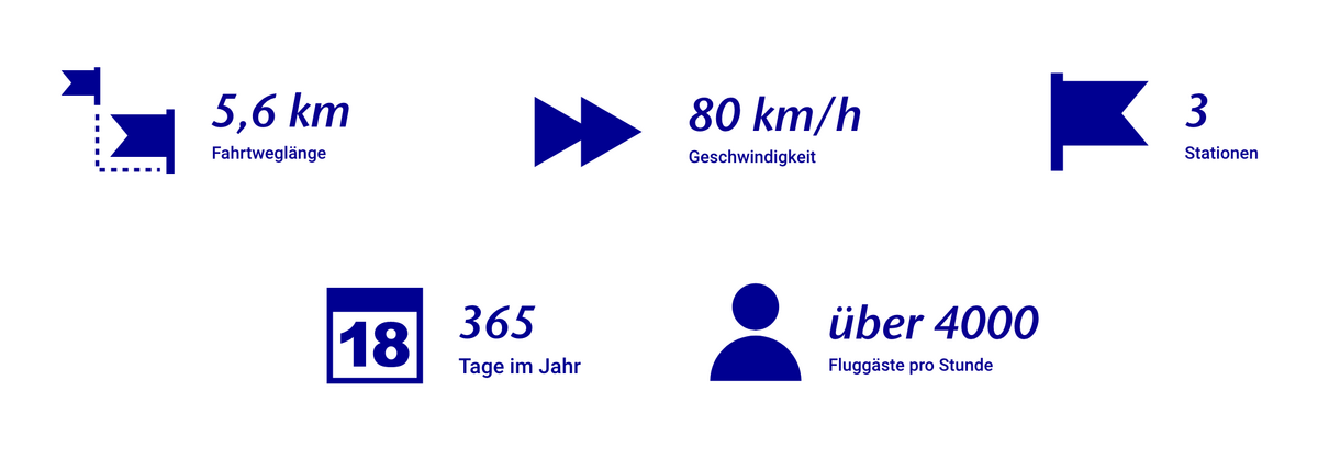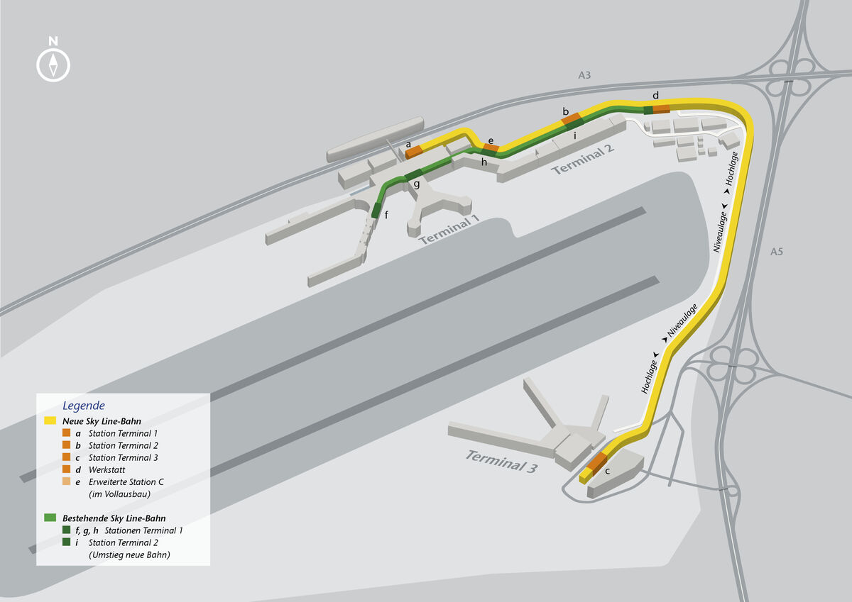 Während der Fahrt auf der 5,6 Kilometer langen Strecke erreicht die neue Bahn eine Geschwindigkeit bis zu 80 km/h. Auf dem Weg von der neuen Station am Terminal 1 nahe dem Fern- und Regionalbahnhof, vorbei an Terminal 2, entlang der Autobahn A5 in Richtung Süden, bis zum Terminal 3 wechselt die Bahn zwischen mehreren Ebenen. Die neue Sky Line-Bahn fährt deshalb sowohl in Hochlage – etwa zwischen Terminal 1 und 2 – als auch ebenerdig entlang der Autobahn.