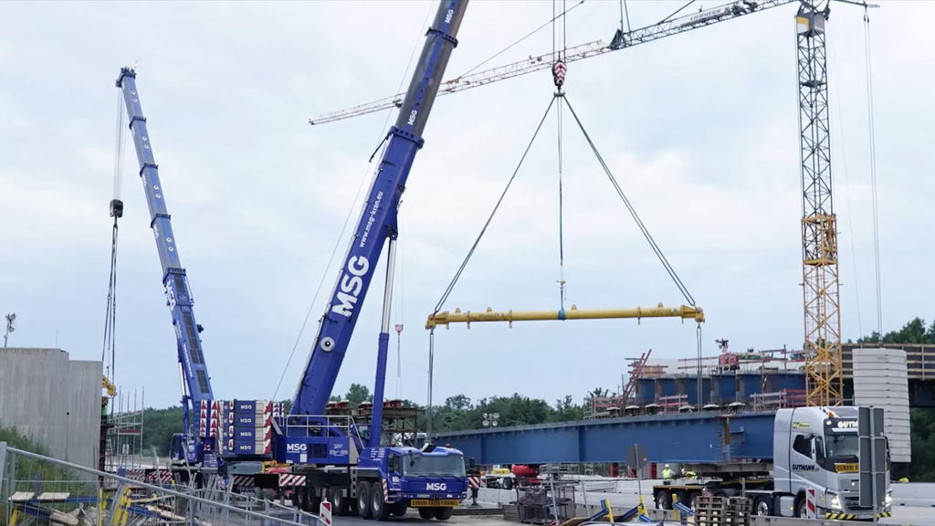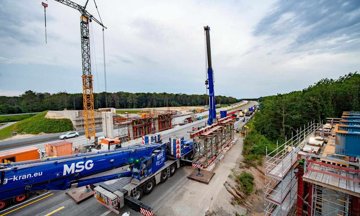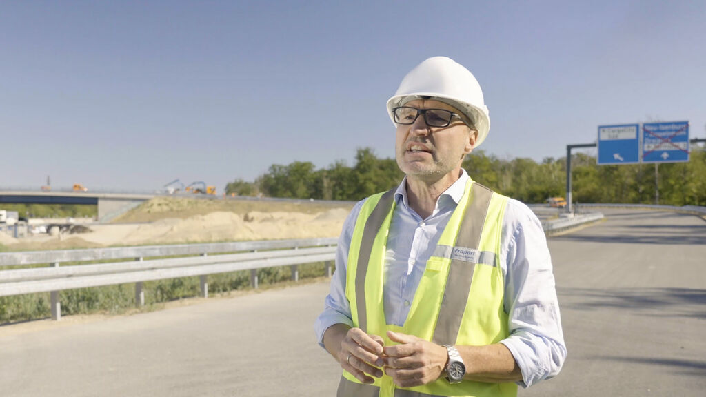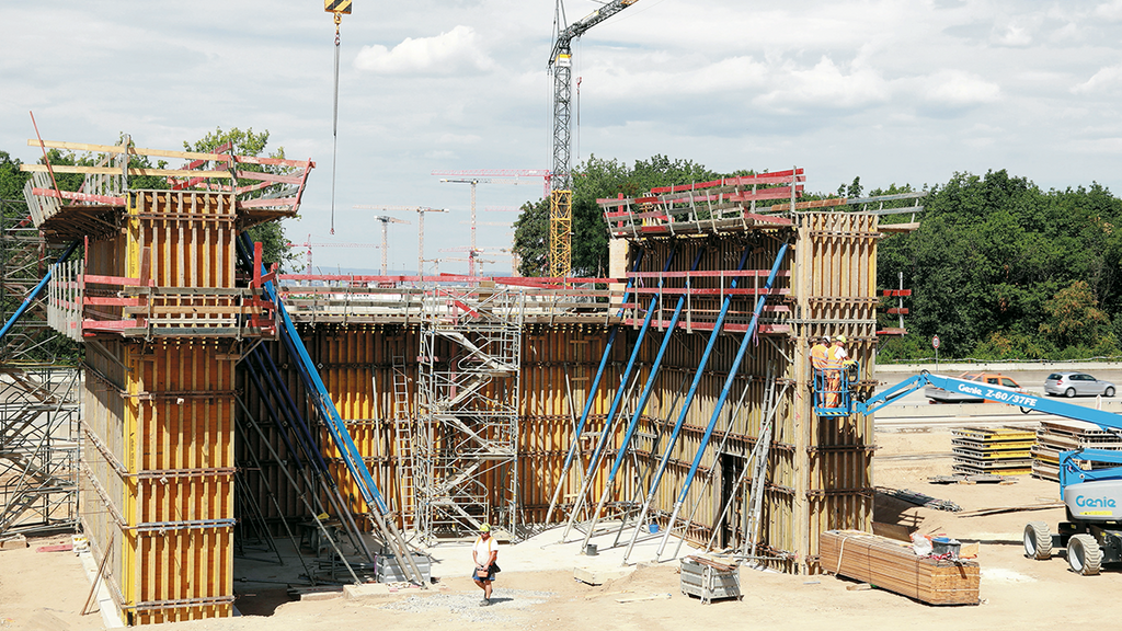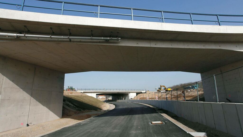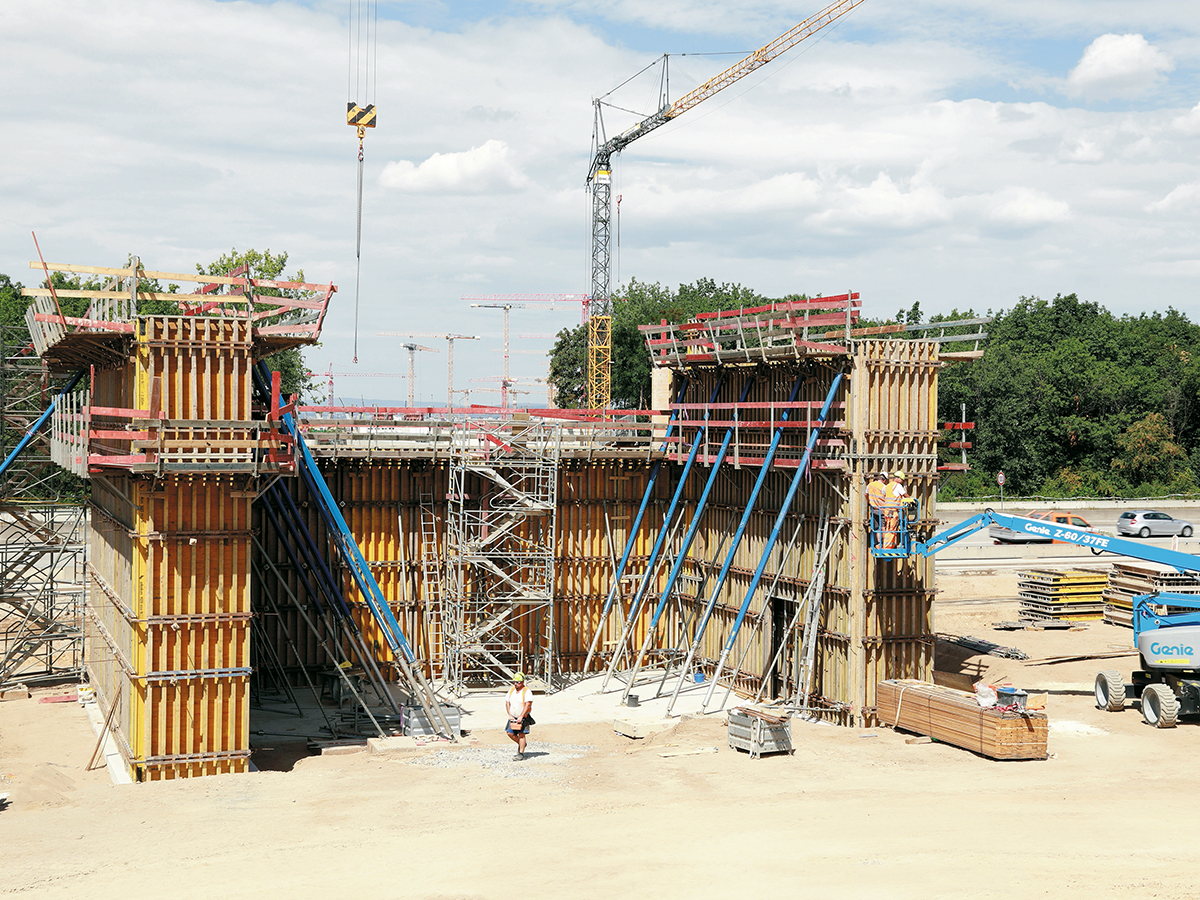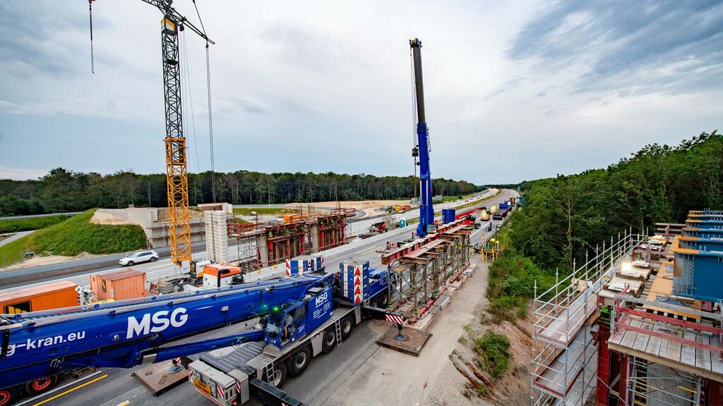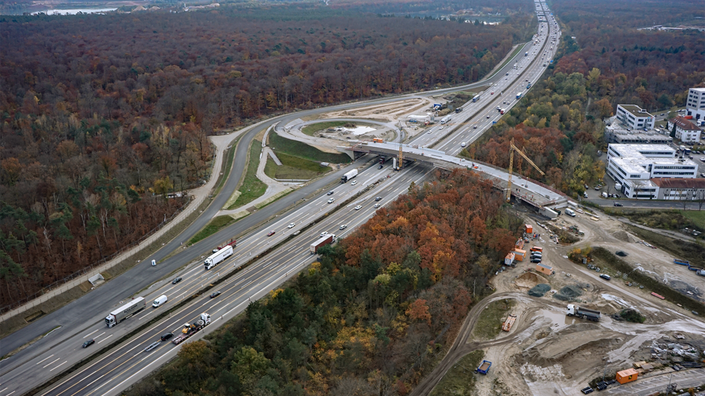 Insgesamt 71 Bohrpfähle auf beiden Seiten der Autobahn sorgen für einen sicheren Stand der künftigen Brückenpfeiler; zusätzliche Stabilität verschaffen sechs weitere Pfähle im Bereich des Mittelstreifens. Doch genauso wie das neue Terminalgebäude bei laufendem Flughafenbetrieb gebaut wird, musste auch der Straßenverkehr der A5 trotz Brückenbau weiter fließen. Gleichzeitig bedarf es beim Brückenbau einer gewissen Baufreiheit. Zeitweise wurde daher eine Fahrbahnseite gesperrt – auf ihr rollten dann vorübergehend Mobilkräne anstatt der gewohnten Pkws und Lkws. Sie hoben beispielsweise Stahlelemente und Fertigteilplatten ein. Die Bauarbeiter verbanden die Platten dann vor Ort mit Mörtel und sogenannten Kopfbolzen. Dabei handelt es sich um Stahlstifte, deren Köpfe an einen flachen Pilz erinnern. Bei den Überbauten der Brücke floss dann wieder Ortbeton.