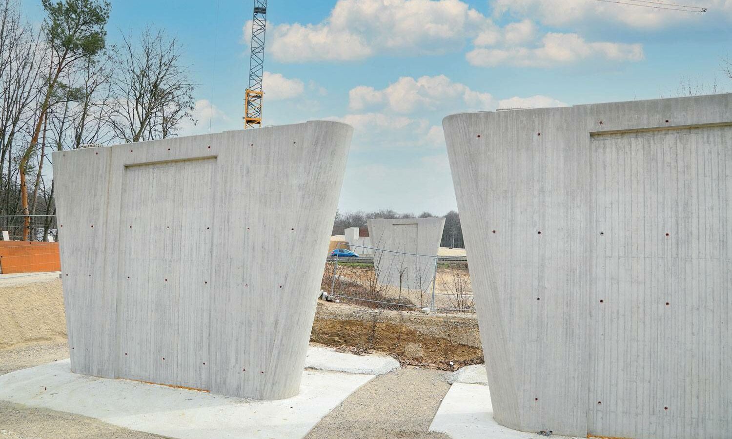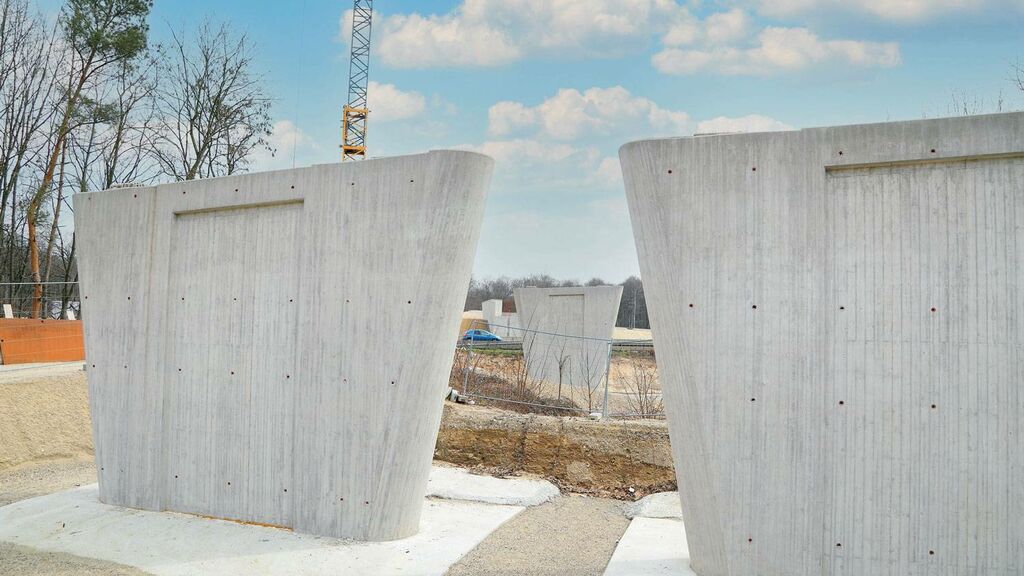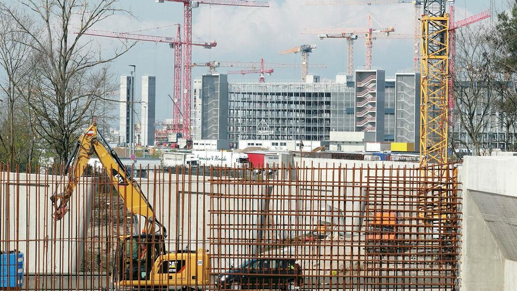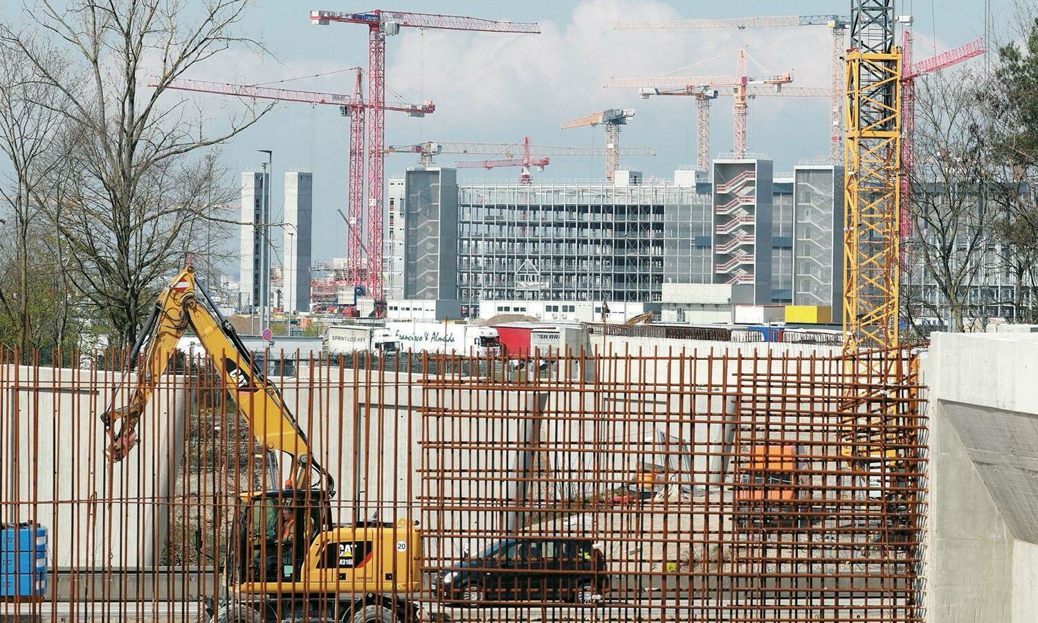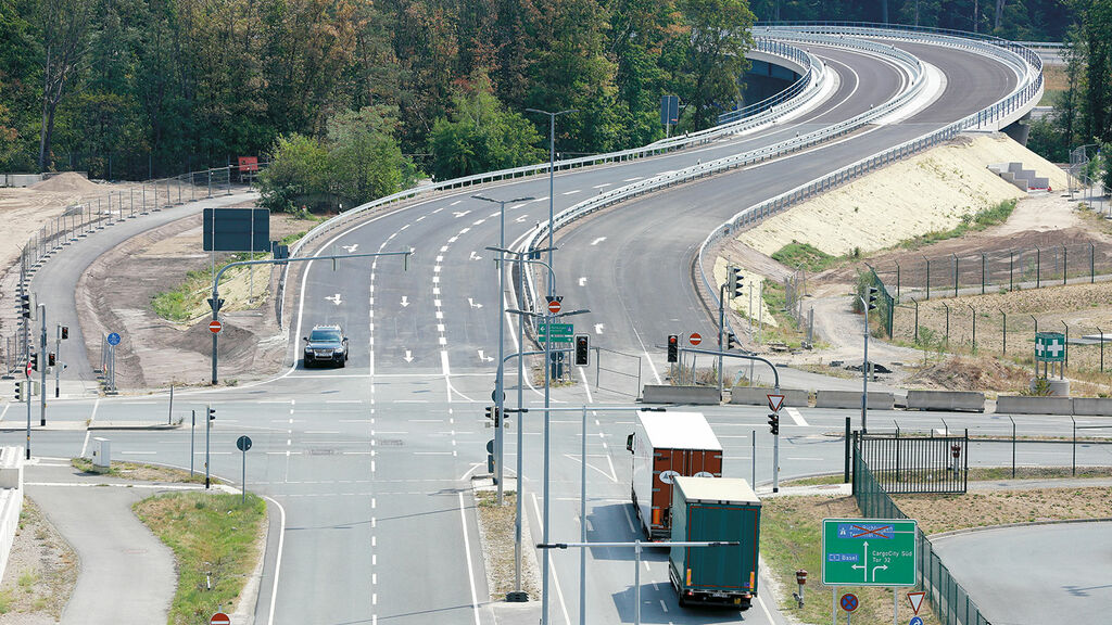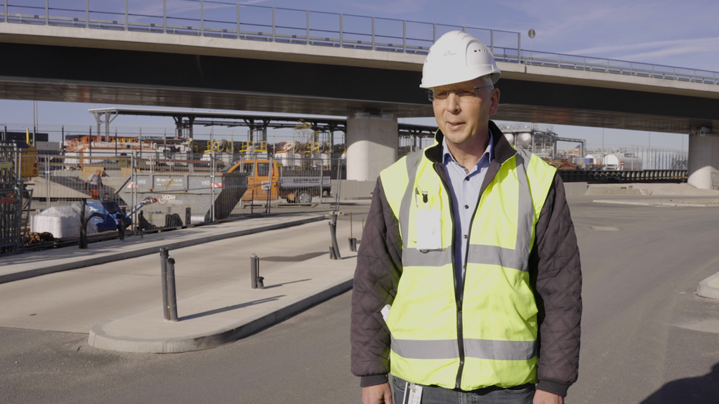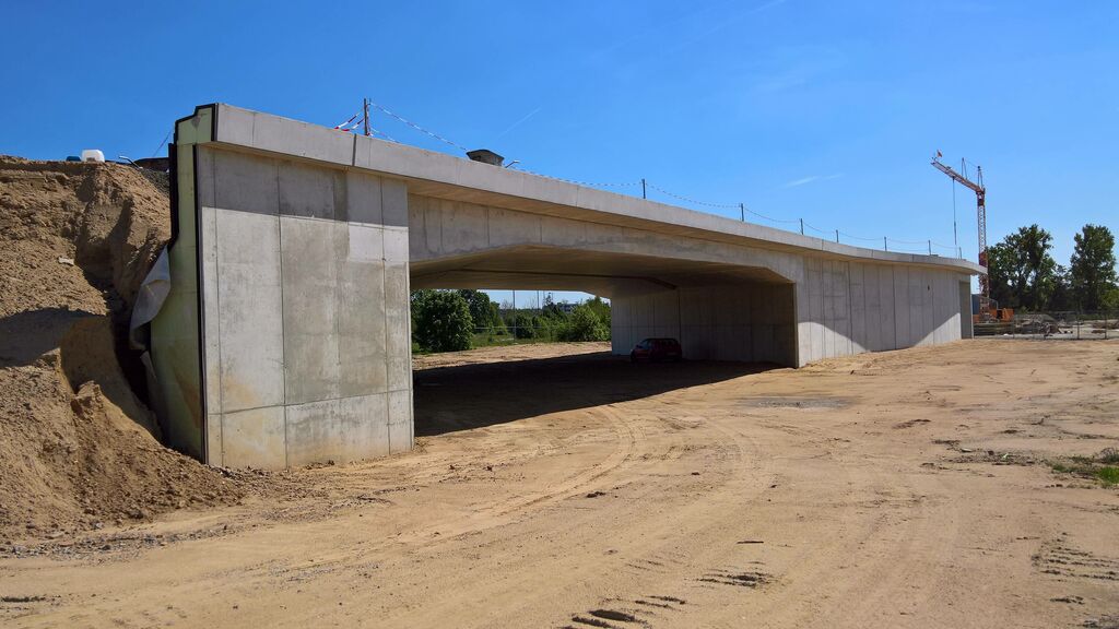 Insgesamt 71 Bohrpfähle auf beiden Seiten der Autobahn sorgen für einen sicheren Stand der künftigen Brückenpfeiler; zusätzliche Stabilität verschaffen sechs weitere Pfähle im Bereich des Mittelstreifens. Doch genauso wie das neue Terminalgebäude bei laufendem Flughafenbetrieb gebaut wird, musste auch der Straßenverkehr der A5 trotz Brückenbau weiter fließen. Gleichzeitig bedarf es beim Brückenbau einer gewissen Baufreiheit. Zeitweise wurde daher eine Fahrbahnseite gesperrt – auf ihr rollten dann vorübergehend Mobilkräne anstatt der gewohnten Pkws und Lkws. Sie hoben beispielsweise Stahlelemente und Fertigteilplatten ein. Die Bauarbeiter verbanden die Platten dann vor Ort mit Mörtel und sogenannten Kopfbolzen. Dabei handelt es sich um Stahlstifte, deren Köpfe an einen flachen Pilz erinnern. Bei den Überbauten der Brücke floss dann wieder Ortbeton.