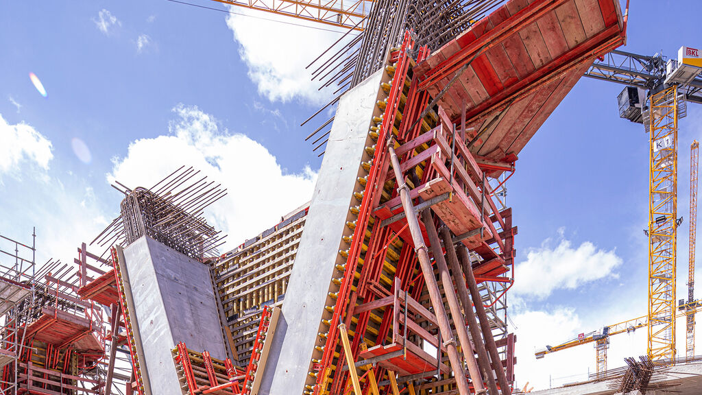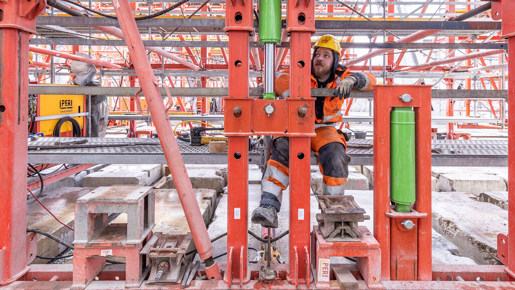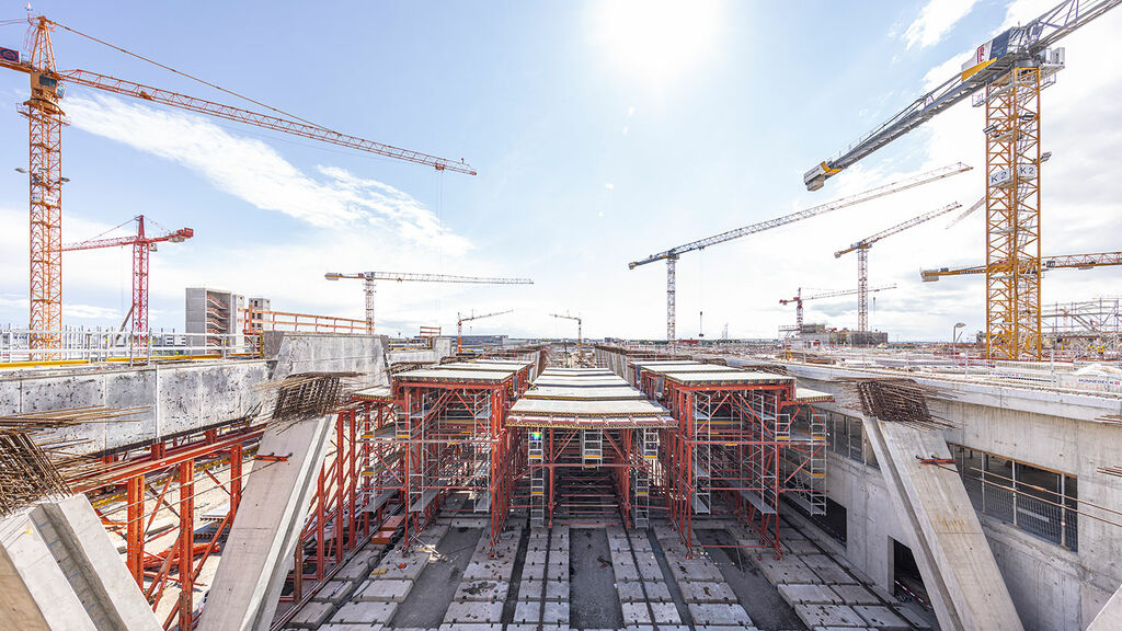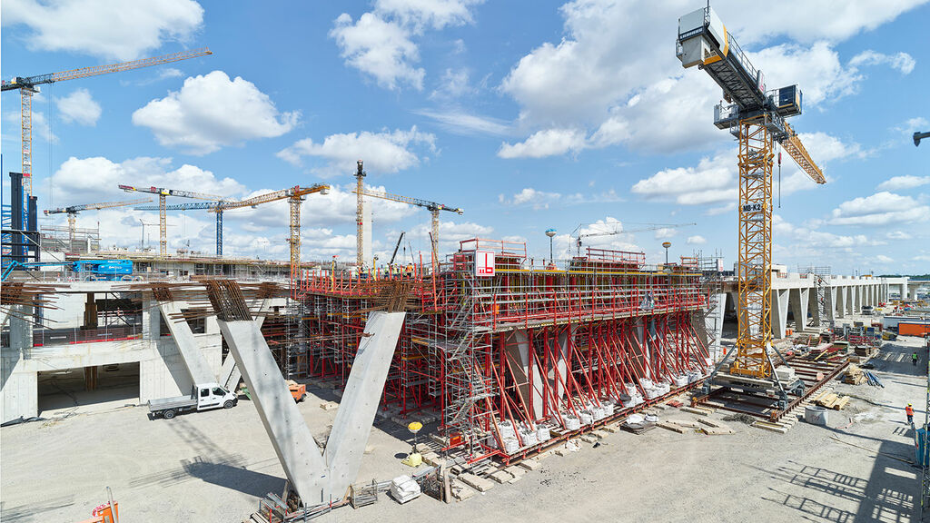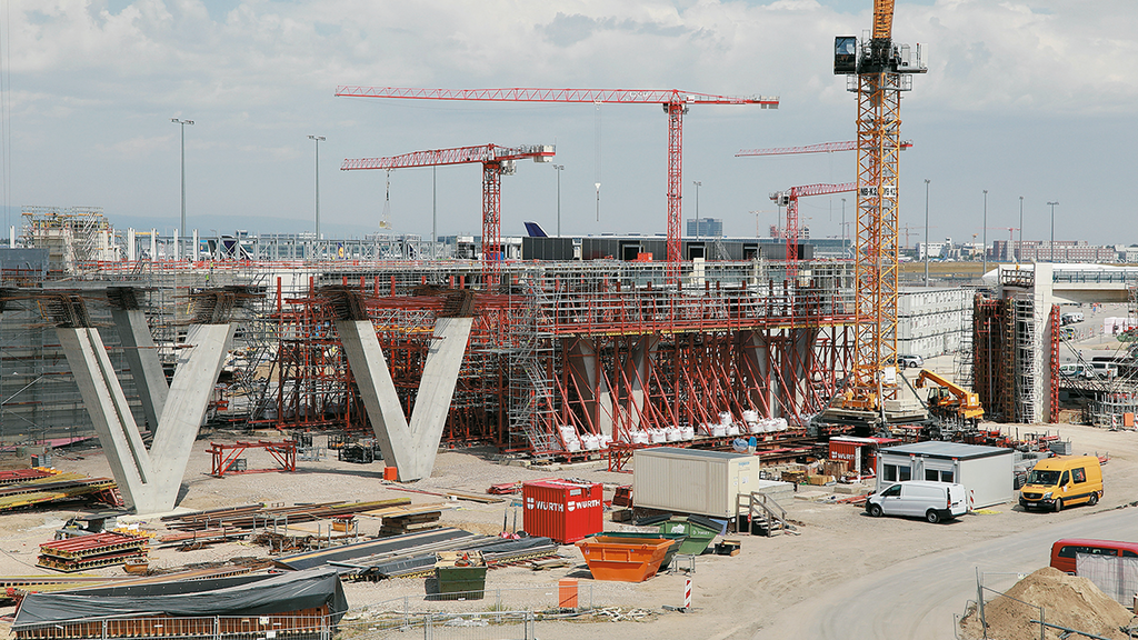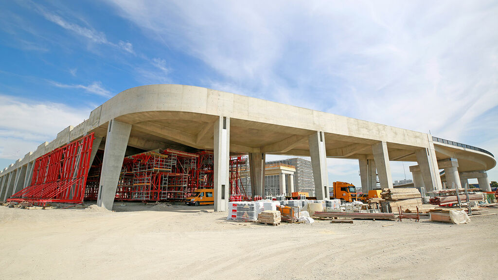 Der Vorfahrtstisch ermöglicht Fluggästen eine bequeme Ankunft auf der Abflugebene vor dem Eingang des neuen Terminal 3. Der hochgelegene Straßenbereich ist mehr als einen halben Kilometer lang und fast 30 Meter breit. Der Beton für die einzelnen Abschnitte des Bauwerks wird in Schalungen gefertigt. Nachdem der Beton ausgehärtet ist, wird die Schalung entfernt und für den nächsten Abschnitt verwendet. Dafür nutzen die Arbeiter Schalwagen, also riesige Traggerüstkonstruktionen, die alle relevanten Einbauteile der einzelnen Abschnitte beinhalten. Beim Terminal 3 hat die Fa. PERI maßgeschneiderte Schalungssysteme bereitgestellt.
