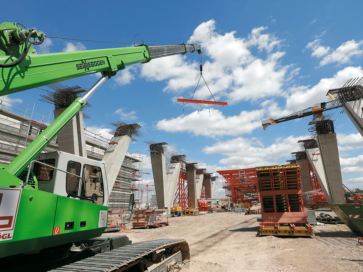 Ein Brückenbauwerk dieser Dimension braucht ein stabiles Fundament. Dafür wurden Mitte 2019 zunächst die tragenden Pfähle im Boden verankert. Bis zu 155 Tonnen schwere Baugeräte haben dafür 13 Meter tief in den Boden gebohrt. Eine Herausforderung für die Arbeitenden vor Ort: Sie müssen die gewaltigen Maschinen bedienen und zentimetergenau justieren. Auf die Pfähle setzen dann die sogenannten Pfahlkopfplatten auf, die letztlich den Untergrund für die Stützen des Vorfahrtstisches bilden. 70 an der Zahl werden das Brückenbauwerk tragen. 56 davon werden auf einer geraden Linie von Osten nach Westen errichtet. Sie halten aber nicht nur die darüber liegende Straße, sondern bieten zudem auch Platz für Leitungen, beispielsweise für Abwasser. Diese werden in das Innere der Stützen gelegt.