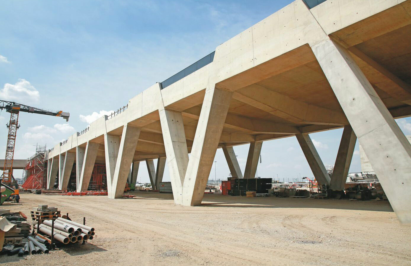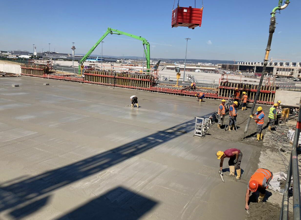 Doch warum hat sich der Bauherr Fraport für die komplexe V-Form der Stützen entschieden? Das hat nicht nur optische Gründe. Die V-Form bietet beim späteren Betrieb von Terminal 3 im ebenerdigen Bereich mehr Platz als konventionelle Säulen. Letztere hätten enger gestellt weniger Platz für zum Beispiel Rangierprozesse geboten.
