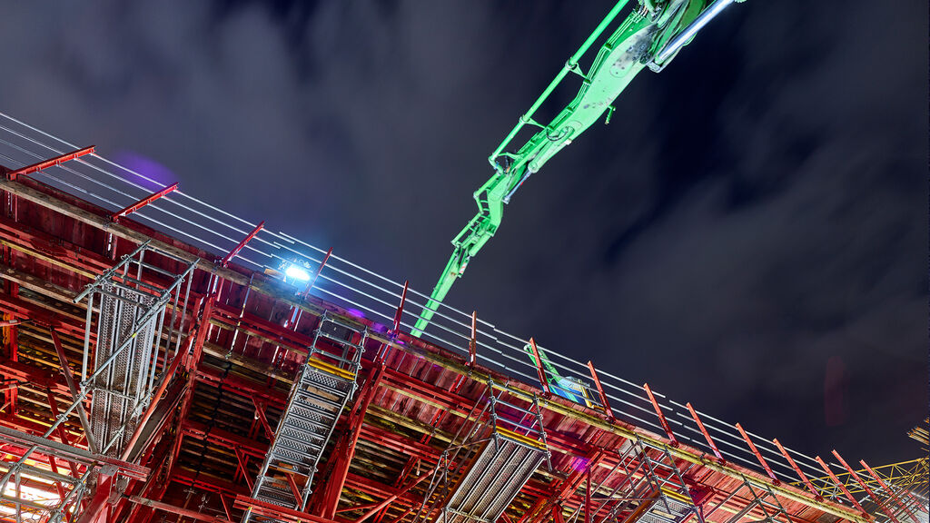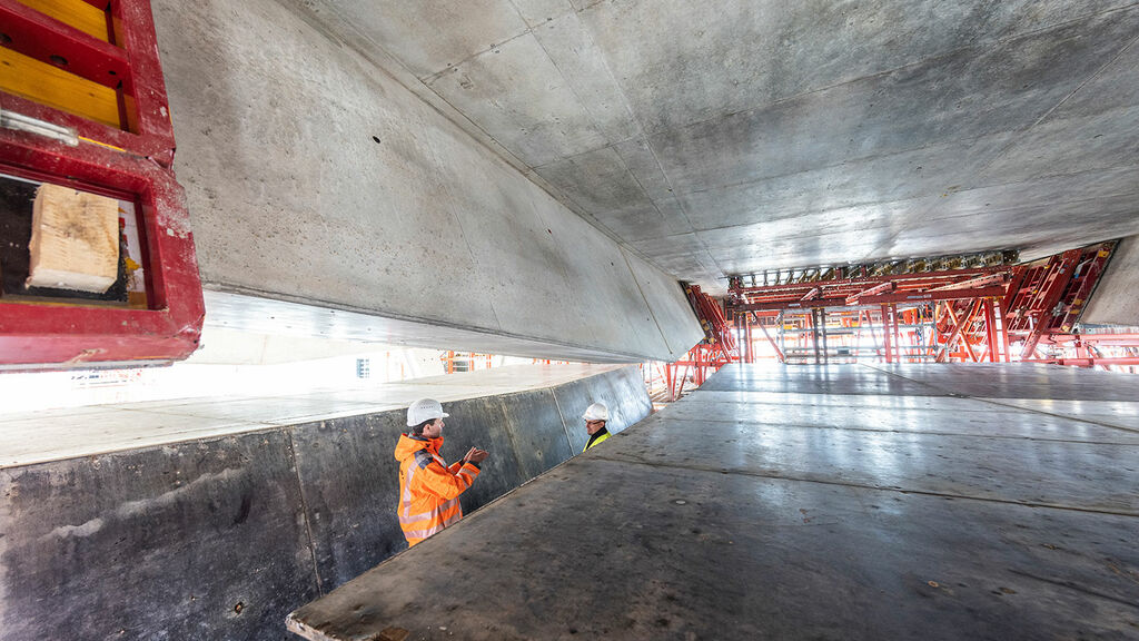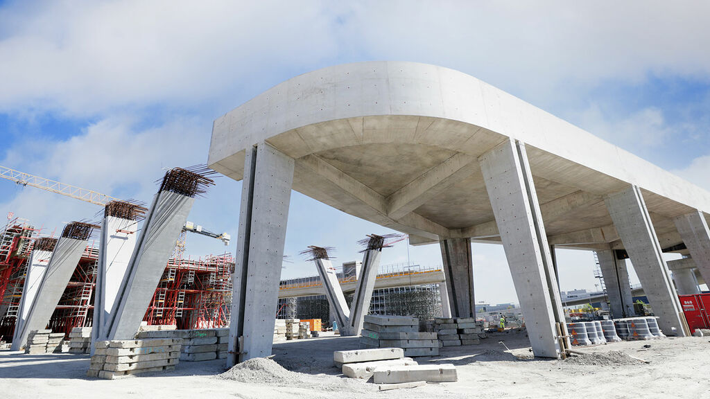 Die charakteristische V-Form der Stützen stellt dabei besondere Anforderungen an die Planungen der Statikerinnen und Statiker. Mithilfe einer Probestütze im Originalmaß konnten Statikerinnen und Statiker sowie Bauingenieurinnen und Bauingenieure überprüfen, ob ihre Planungen sich auch in die Realität umsetzen lassen und anschließend grünes Licht geben. Der Startschuss für die Herstellung der V-Stützen fiel dann im ersten Quartal 2020. Deren Konstruktion umfasst immer die gleichen drei Schritte: Schalung, Bewehrung, Beton. Dabei geben die Schalung und Bewehrung bereits die besondere Form der Stützen vor, die den Vorfahrtstisch tragen. Die Arbeitenden lassen dann selbstverdichtenden Beton von oben in die V-Form fließen. Dabei muss die Betonage auch aufgrund der Stützenhöhe von circa zehn Metern besonders akribisch protokolliert und begleitet werden, denn: Der Beton übt Druck auf die Schalung aus. Dieser darf die dafür vorgegebenen Werte nicht überschreiten. Nachdem die ersten Stützen fertiggestellt waren, konnten schon die vorbereitenden Maßnahmen für den Überbau beginnen. Insgesamt 14 Abschnitte à 36 Meter Länge mussten betoniert werden, damit künftig alle Reisenden, Besucherinnen und Besucher bequem zum Hauptgebäude gelangen können.
