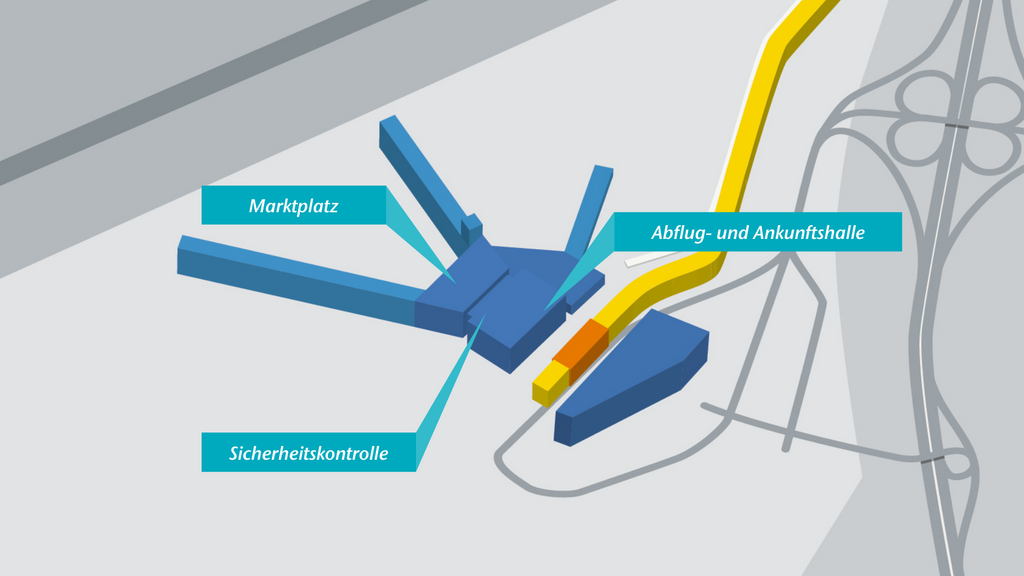 Nach dem Check-in-Bereich gelangen die Reisenden durch die Sicherheitskontrollen auf den futuristischen Marktplatz mit seinen vielfältigen Boutiquen und Restaurants, die zum Verweilen einladen. Hier wartet ein besonderer Blickfang: Die Decke besteht aus tropfenförmigen Stahlkonstruktionen. Dadurch lässt sich das einfallende Tageslicht in einzelnen Bereichen bündeln.